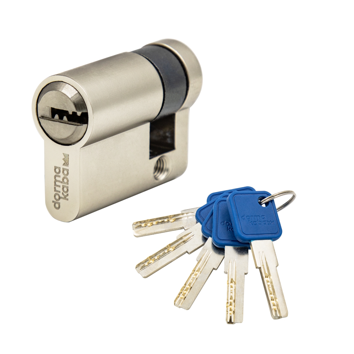 The durability and stable operation of the cylinders are ensured by high-quality materials that are used to manufacture them. The body, insert, pins, thumbturn, and keys are all made of brass. The set includes reversible dimple keys with a plastic head and a 14 mm key neck. Five keys that are 2.4 mm thick are included.