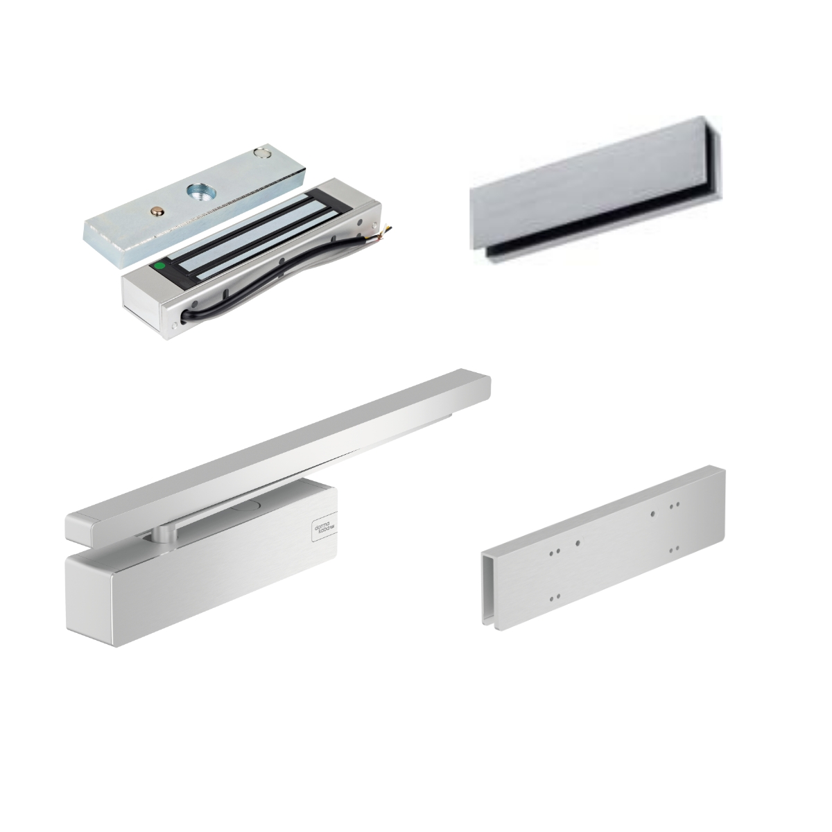 The ACS hardware kit for all-glass doors includes an electromagnetic lock, door closer with a slide channel, and mounting plates.