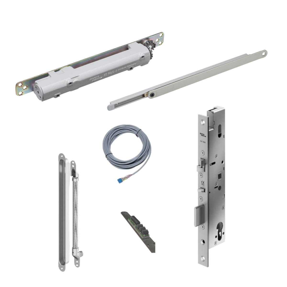 The ACS hardware kit for profile doors includes an electromechanical lock, connecting cable, cable conduit, and a concealed door closer.