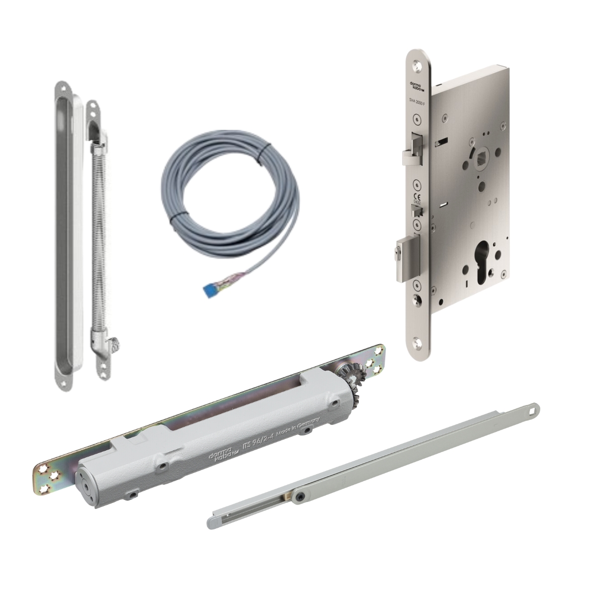 The ACS hardware kit for solid doors includes an electromechanical lock, connecting cable, cable conduit, and a concealed door closer.