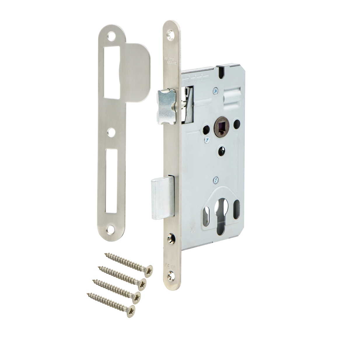 A strike plate and fastening screws are included.